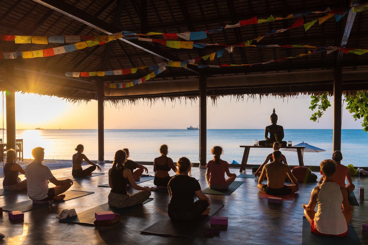 Занятия проходят на специальной площадке на берегу моря — на рассвете и на закате.